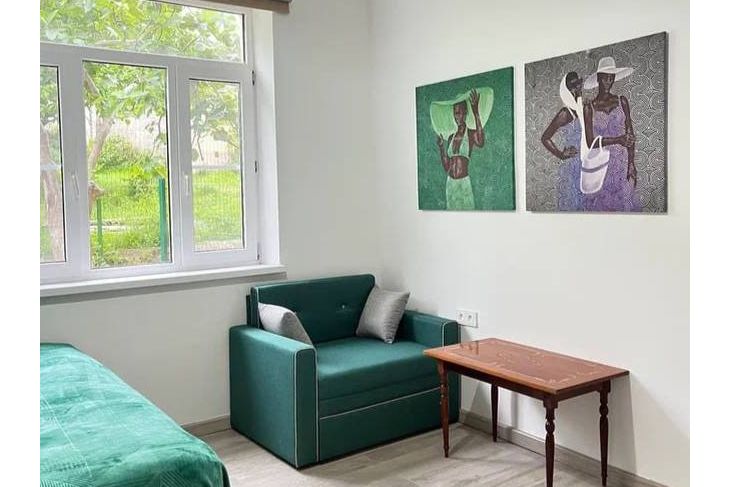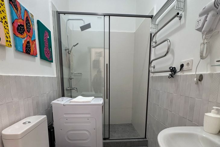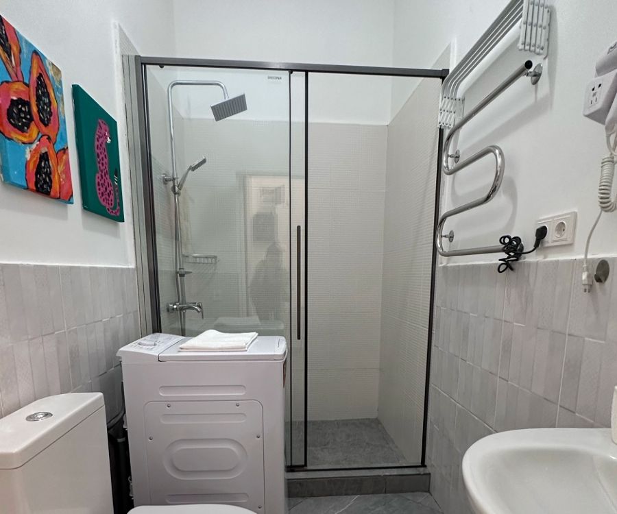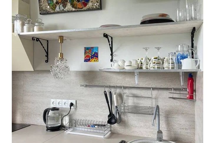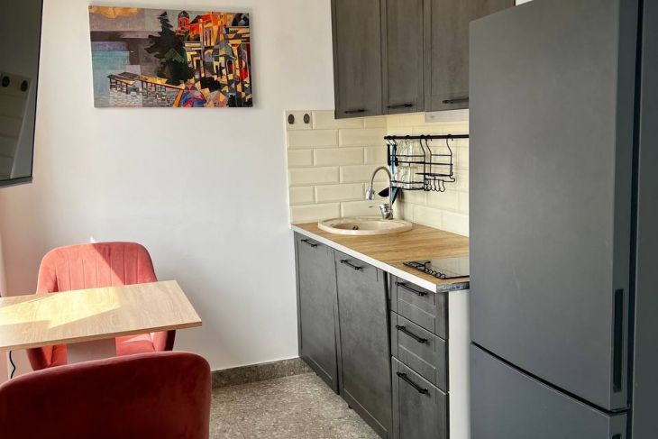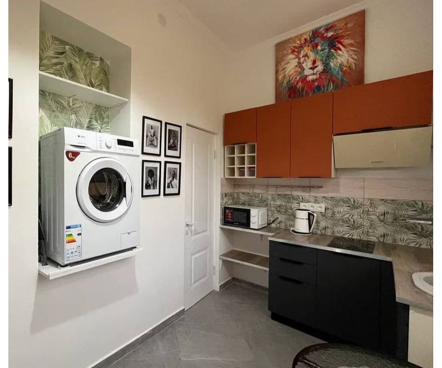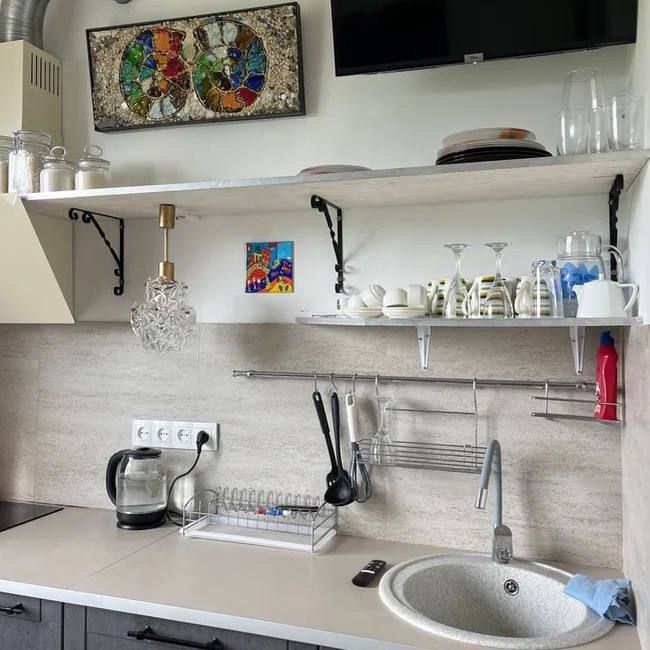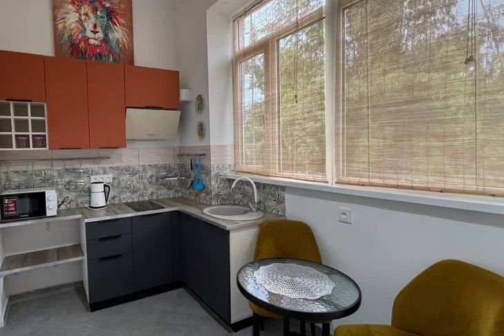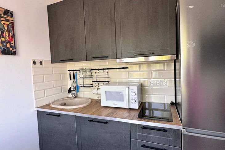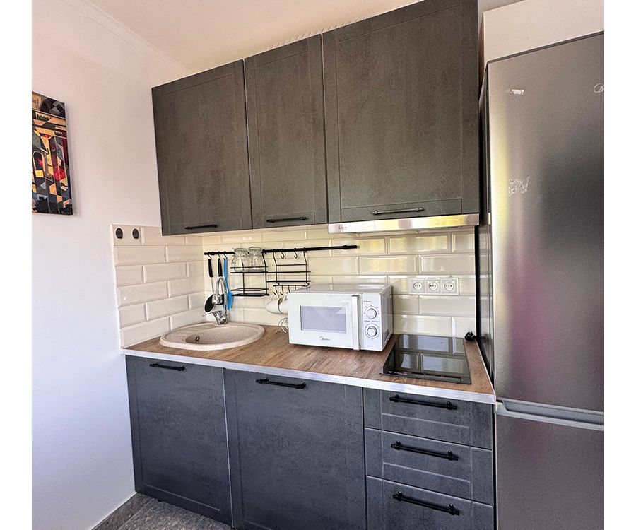 - Полностью оборудованная кухня (плита, СВЧ, чайник электрический)
